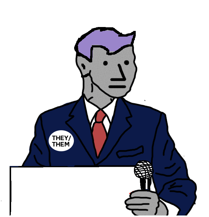 Close ups of the crowd– same faces but different hair styles and pronoun pins with various genders.