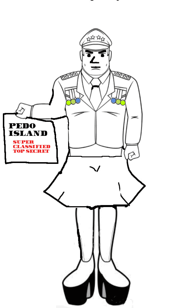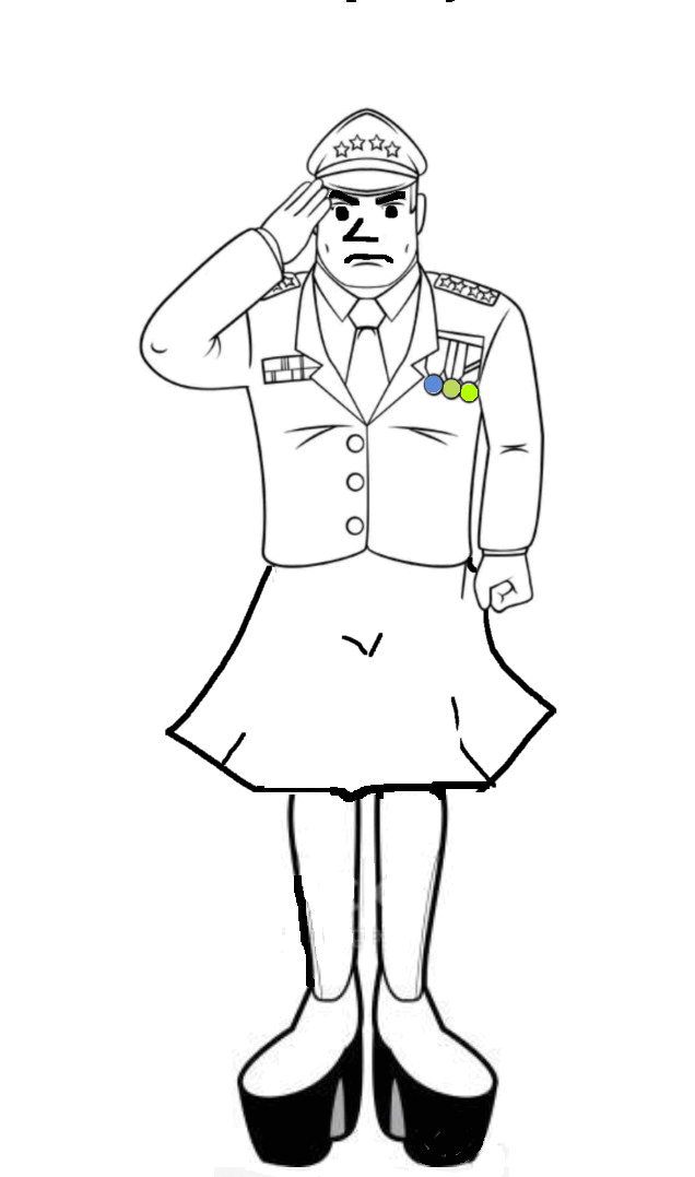 General Brolick is built like Shwarzenegger but wears a skirt. His jacket decorated with army medals.